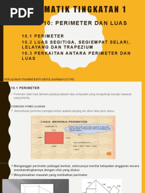 Lkpd Luas Segitiga 2 from reader020.staticloud.net Luas kawasan berwarna = luas segi empat tepat − luas trapezium = ( 12 × 8 ) − 1 2 × ( 4 + 6 ) × 4 = 96 − 20 = 76 cm 2 Dalam rajah di sebelah, prst dan pqwv ialah segi empat tepat. Segi empat tepat yang terbesar mempunyai panjang h cm dan lebar k cm. Luas segi tiga, segi empat selari dan trapezium l. Perimeter objek adalah jumlah panjang semua sisi. Sangat berusaha baik lagi menentukan perimeter pelbagai bentuk apabila panjang sisi diberi atau perlu diukur. Hitungkan luas segi empat selari yang berikut. Sama ada cara mencari luas permukaan dan isipadu memerlukan formula yang sama.